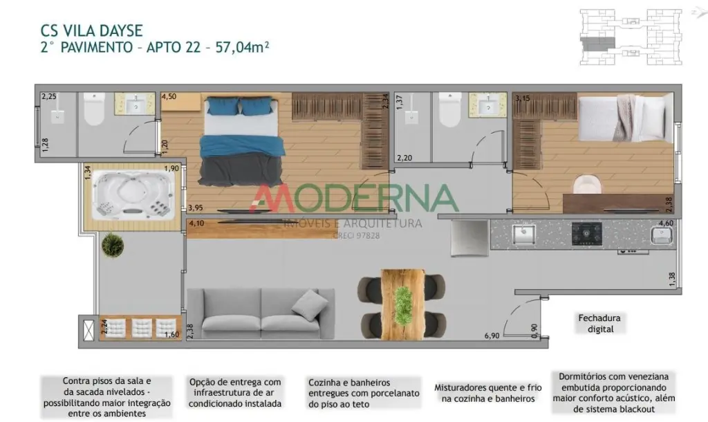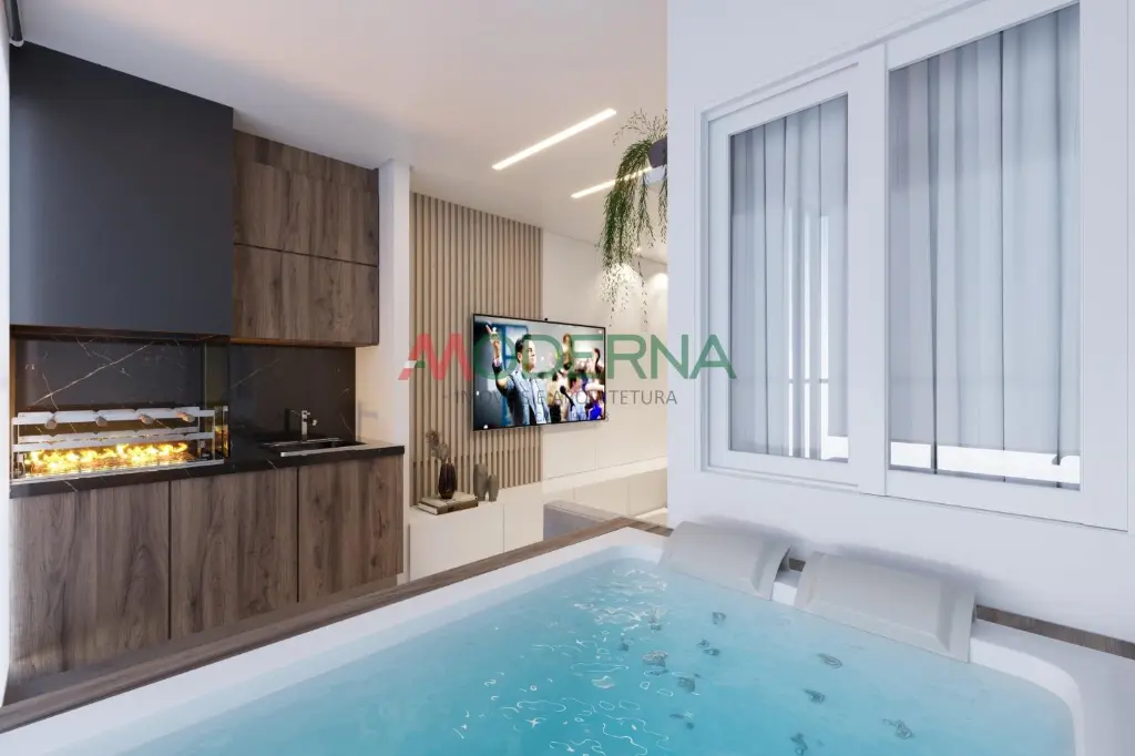 Varanda com jacuzzi para momentos de lazer e convivência. Sala integrada com a cozinha, ampliando o ambiente.