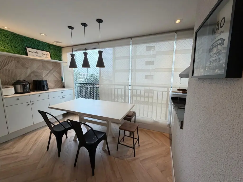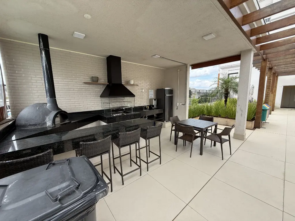 Varanda gourmet com churrasqueira a carvão, ideal para receber amigos e família