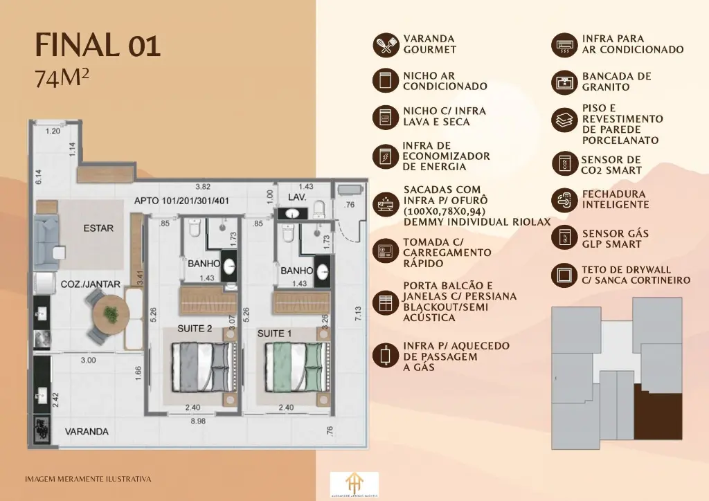 2 dormitórios (2 suítes)LavaboLiving integrado à cozinhaVaranda gourmet01 vaga de garagem Coberturas de 92m² a 116m²