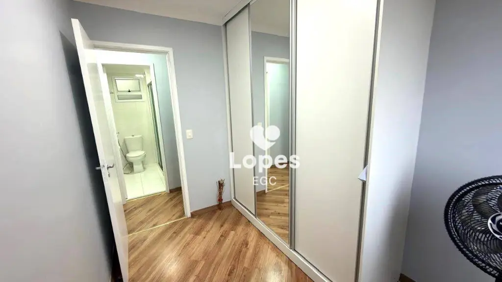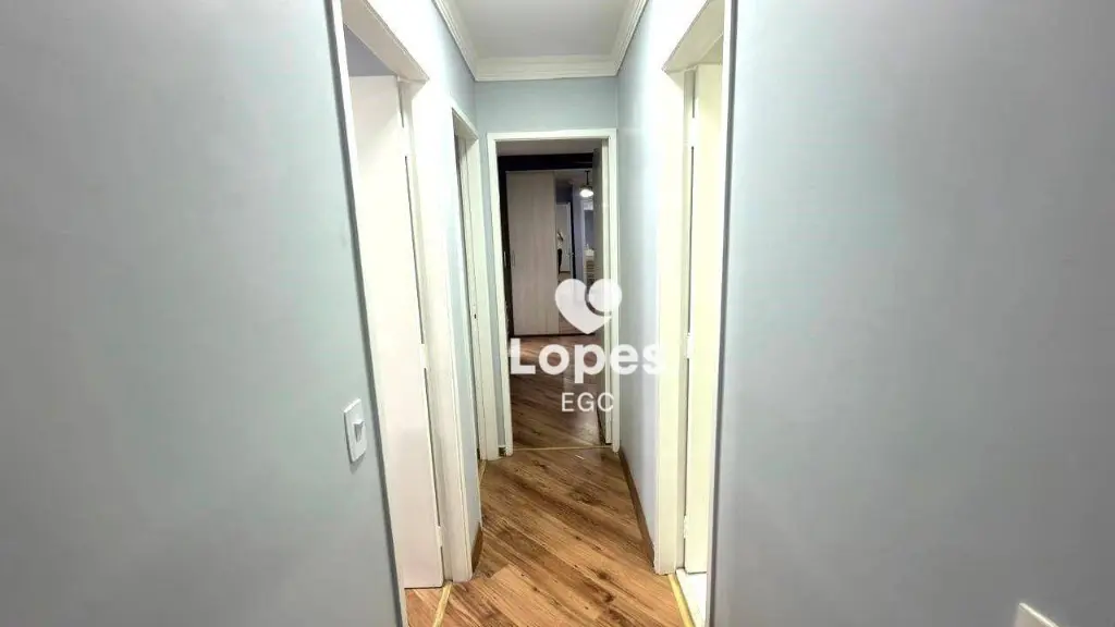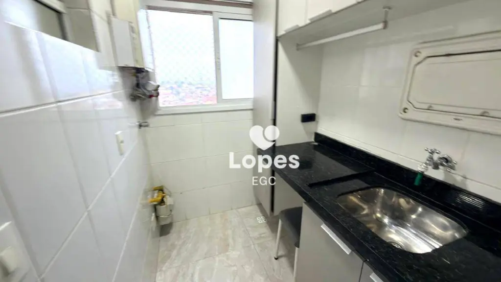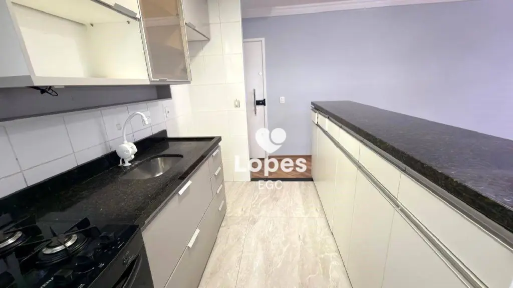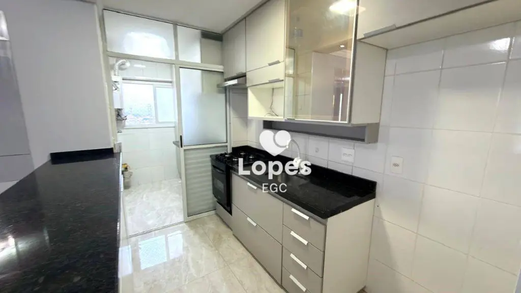A cozinha conta com armários planejados que otimizam o espaço, além de área de serviço funcional. O apartamento possui ainda banheiro social com box de vidro e 2 vagas de garagem, garantindo comodidade e segurança.