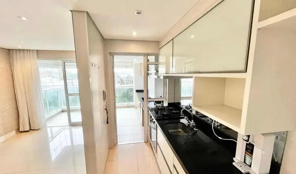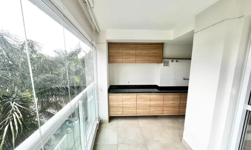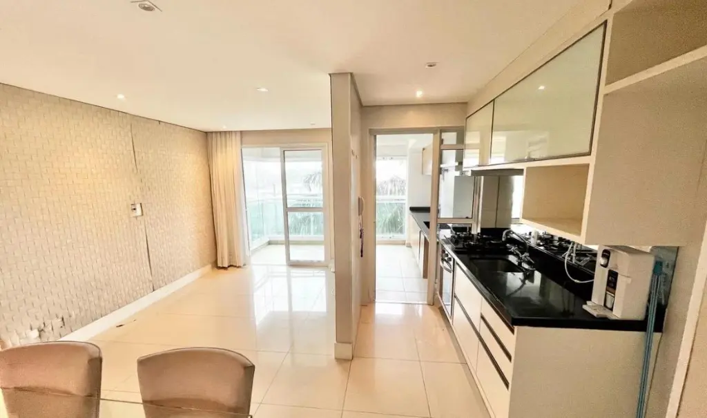 Apartamento com 64 m², 2 dormitórios (1 suíte), sala com varanda, cozinha planejada e 2 vagas de garagem.