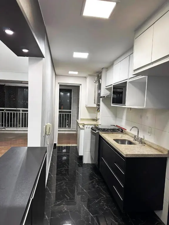 A cozinha é prática e funcional com fogão embutido, integrada à área de serviço, otimizando o espaço e facilitando o dia a dia. O apartamento conta com banheiro social e 2 vagas de garagem cobertas.