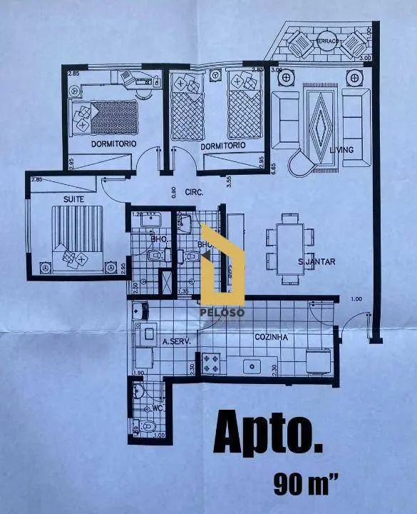 Com 3 dormitórios sendo 1 suíte, sala para 2 ambientes com varanda, cozinha, banheiro social, lavanderia, área de serviço com banheiro.