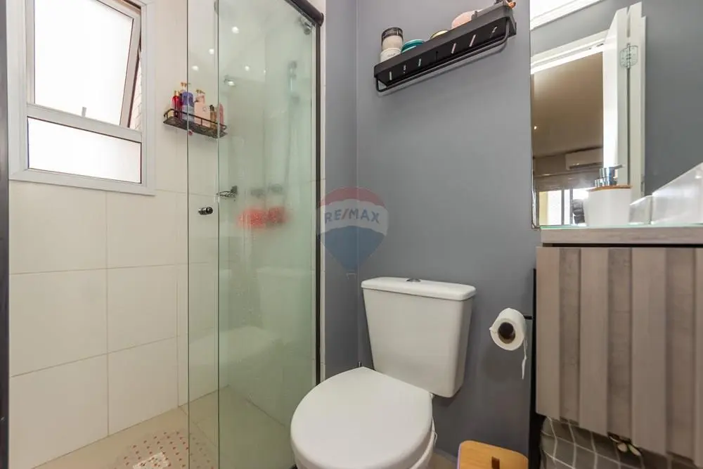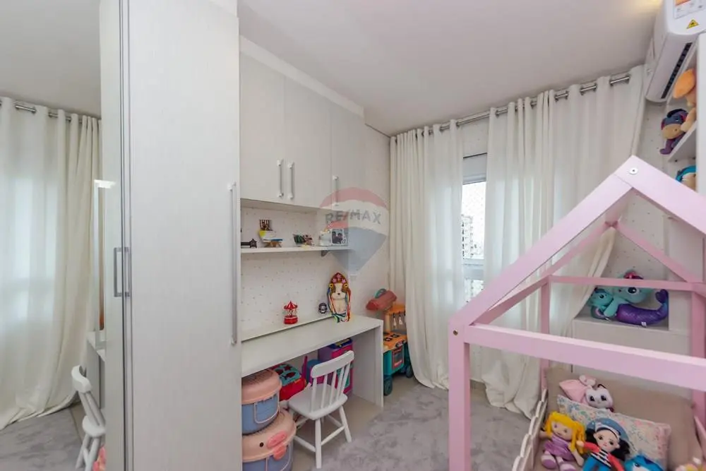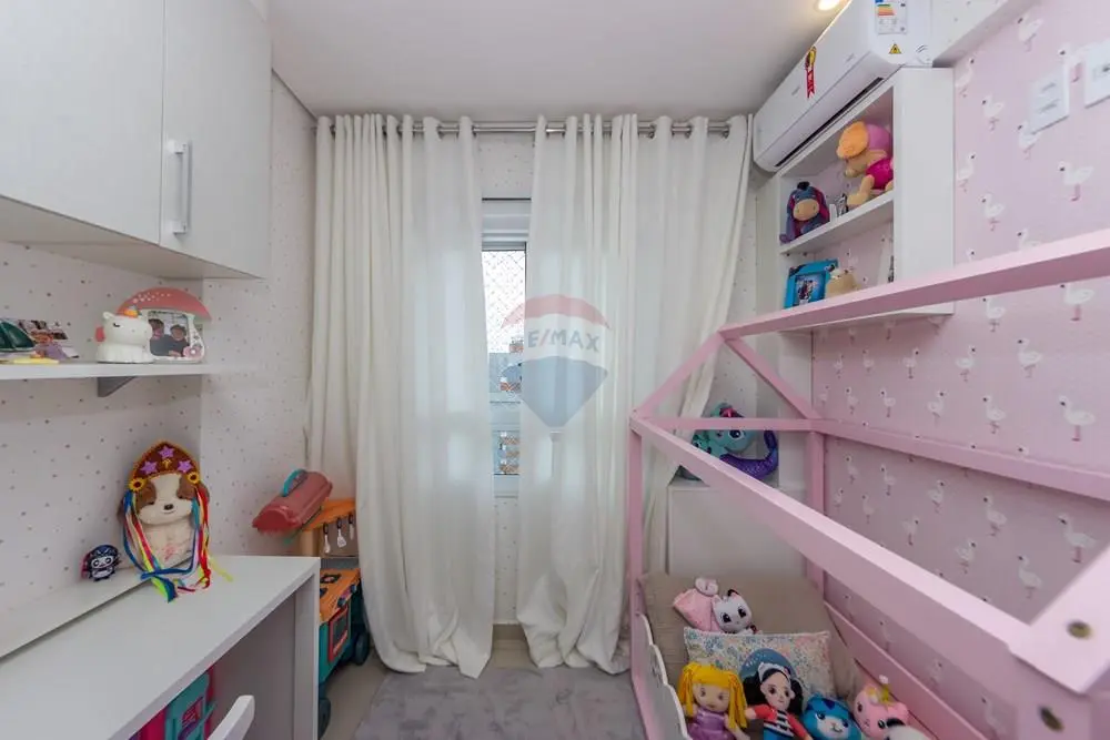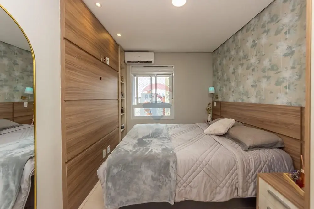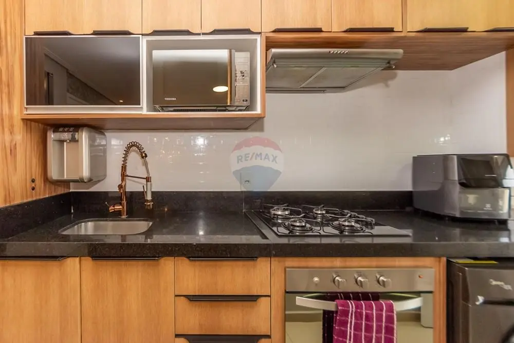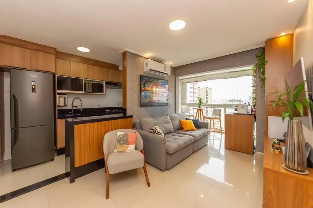A cozinha conta com móveis planejados, com excelente aproveitamento de espaço. O apartamento também possui aquecedor a gás e ar-condicionado instalado na sala e nos dormitórios, proporcionando conforto térmico durante todo o ano.