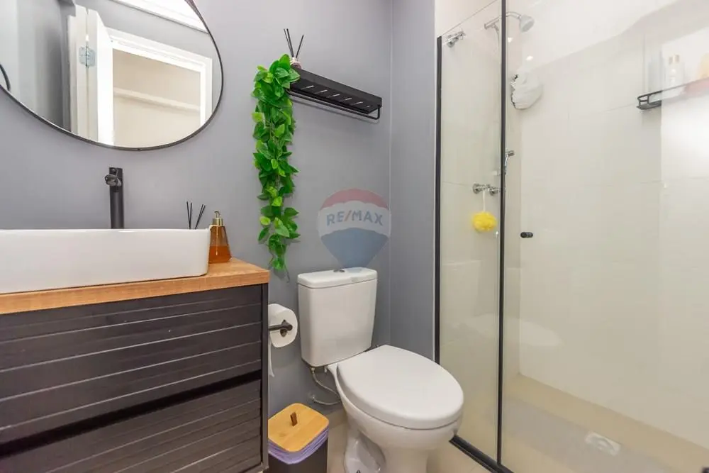 Os banheiros (social e suíte) possuem box de vidro, espelhos e gabinetes, com acabamento moderno.