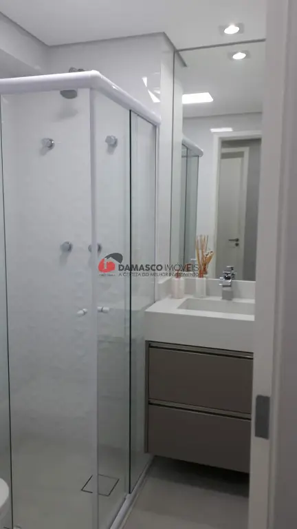 Banheiro com box de vidro e gabinete, com acabamentos modernos e de bom gosto.