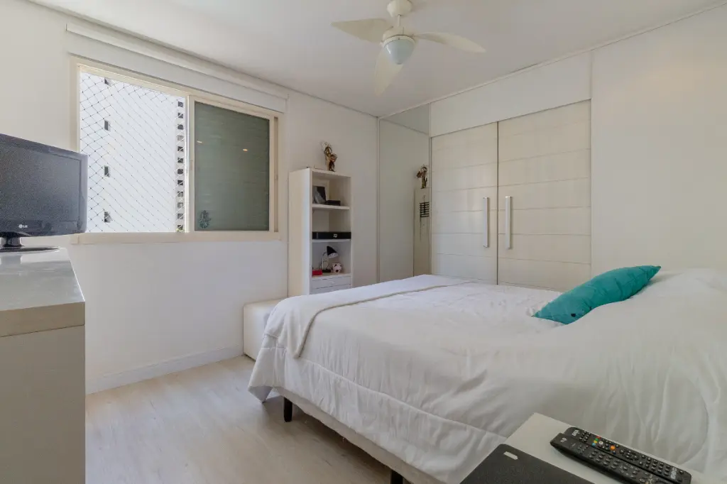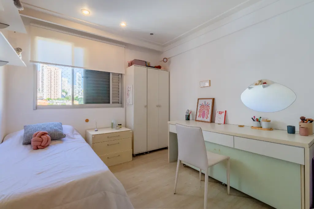 A sala de estar e jantar oferece um espaço agradável para convivência, com potencial para diferentes configurações de decoração. A cozinha é funcional e conta com área de serviço independente, além de dependência de empregada, um diferencial cada vez mais raro e valorizado.