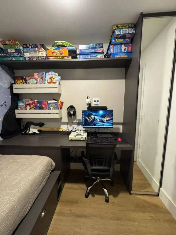 O condomínio oferece estrutura completa: duas piscinas (adulto e infantil), academia equipada, brinquedoteca com brinquedoteca, jacuzzi, sauna, quadra esportiva, salão de festas com cozinha completa (churrasqueira e forno de pizza) e sala de jogos.