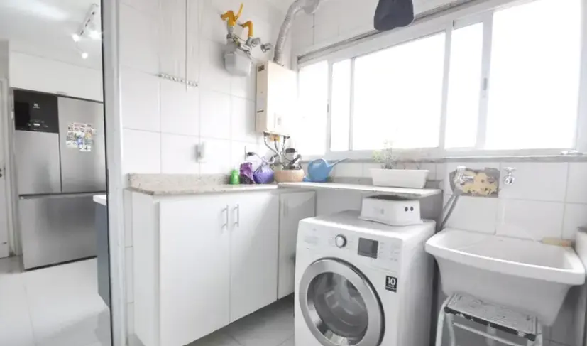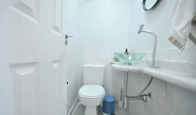 A cozinha planejada oferece praticidade no dia a dia, e a área de serviço com depósito traz ainda mais funcionalidade ao imóvel. No total, são 4 banheiros, incluindo lavabo e dependências de serviço, com acabamento de extremo bom gosto.