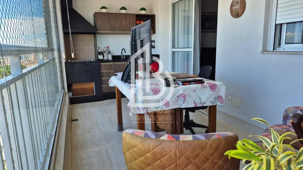 Varanda gourmet envidraçada com churrasqueira a carvão.