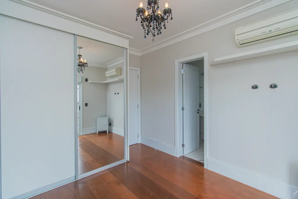 A área íntima conta com três suítes, todas com ar-condicionado, além de um escritório independente, ideal para home office. O imóvel dispõe ainda de lavabo, copa e cozinha equipada com eletrodomésticos, garantindo funcionalidade e praticidade desde o primeiro dia de ocupação.