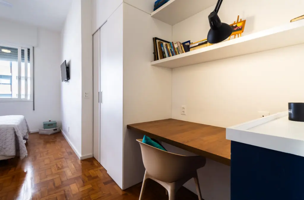 Na área íntima, a suíte principal foi ampliada e ganhou closet e espaço para home office, atendendo às novas necessidades de trabalho em casa. Um segundo dormitório funciona como quarto de hóspedes, mantendo conforto e privacidade para visitas.