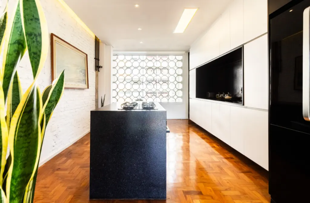 A cozinha foi totalmente remodelada e integrada ao living, com marcenaria planejada que esconde eletrodomésticos e cria uma composição elegante e funcional. O destaque fica para o rack em madeira sob medida, que dialoga com os elementos estruturais aparentes e reforça o caráter contemporâneo do projeto.