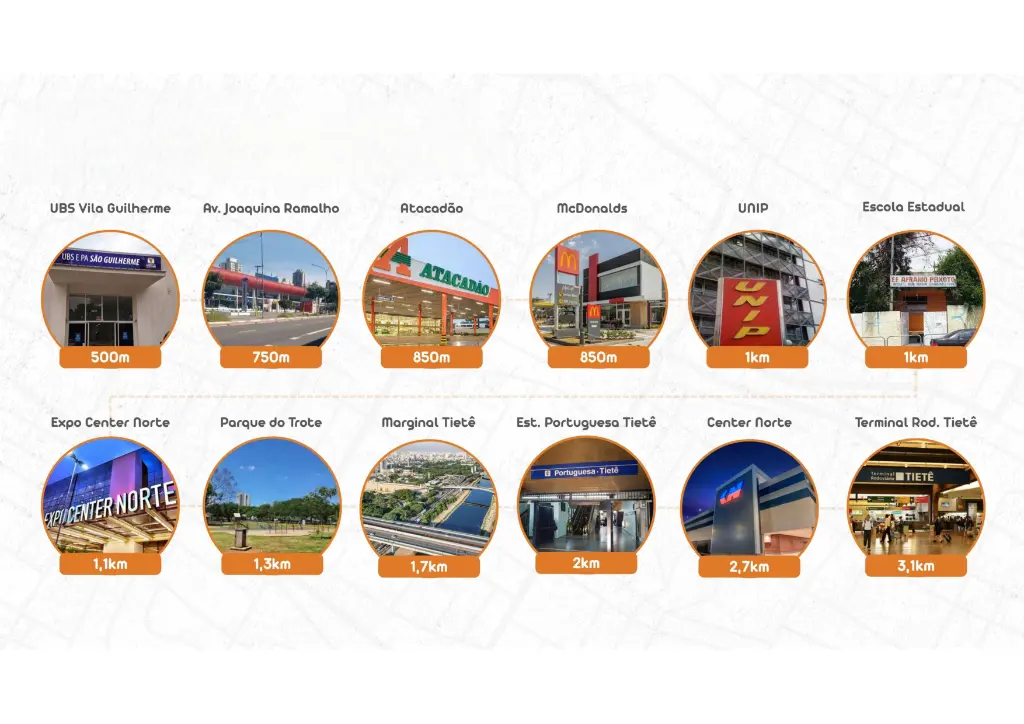 Localização privilegiada próxima ao Shopping Center Norte, Lar Center, Expo Center Norte, Parque da Juventude e Terminal Tietê. Fácil acesso à Marginal Tietê e às estações de metrô Carandiru, Portuguesa Tietê e Santana.