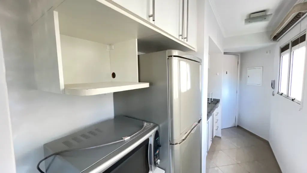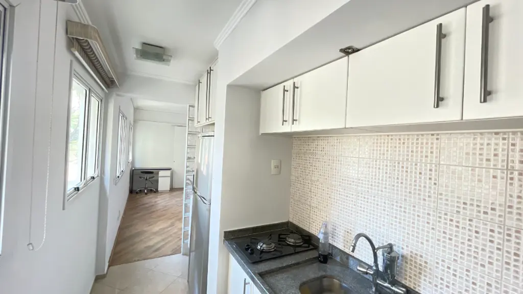 O apartamento conta com cozinha, sala e quarto (suíte) com ar-condicionado e varanda (lado sul) de frente para o condomínio, além de lavanderia compartilhada, proporcionando mais espaço à área útil do imóvel.
