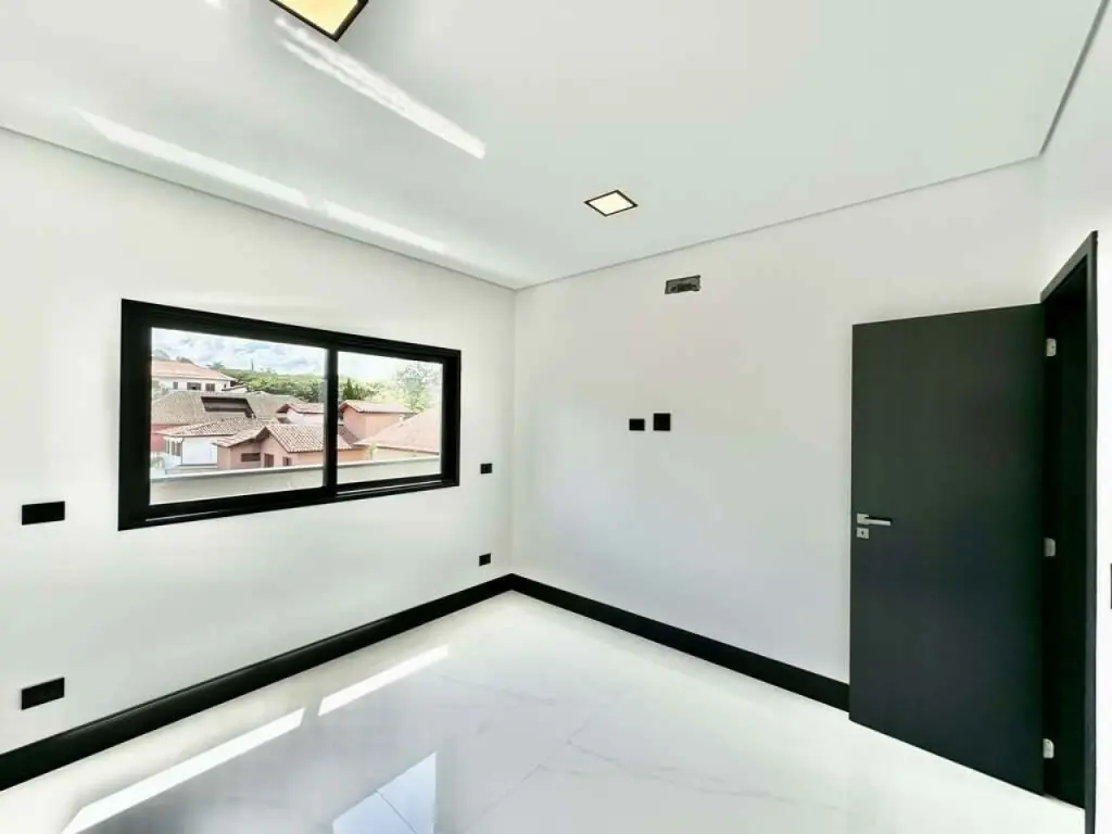Portas e janelas em alumínio preto e vidro, com persianas elétricas nos quartos.