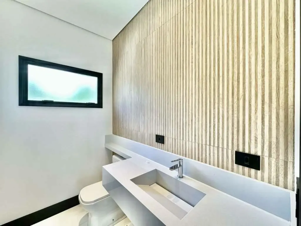 Banheiros com torneiras mono comando, box de vidro, nichos e ralos horizontais. Sendo a master com 2 cubas e banheira.