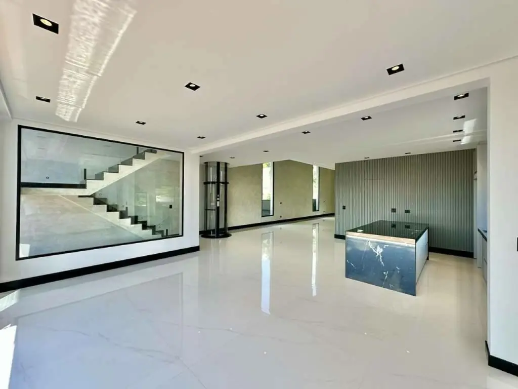 Pisos em mármore, porcelanato, porcelanato rústico e antiderrapante na área externa.