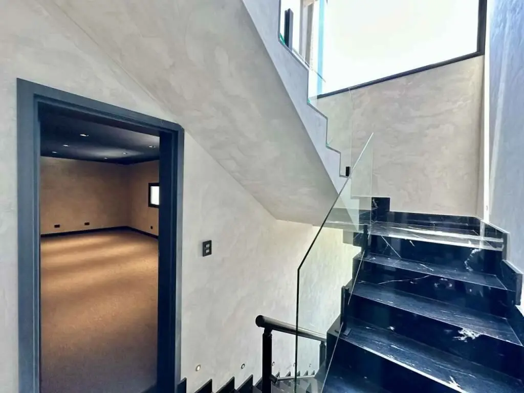 Escadas de alvenaria iluminadas, com guarda corpo em vidro e metal.