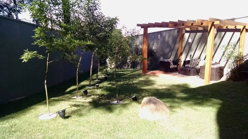 - Pergolado com área de descanso no jardim