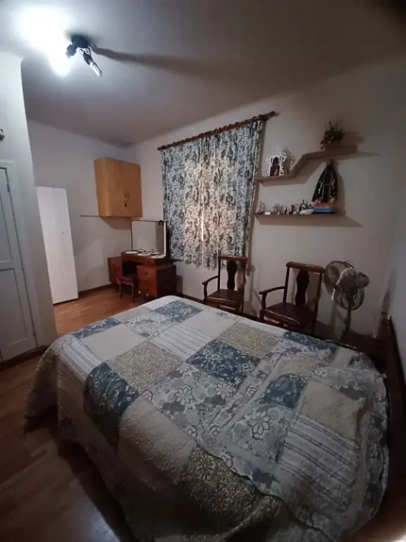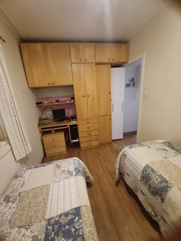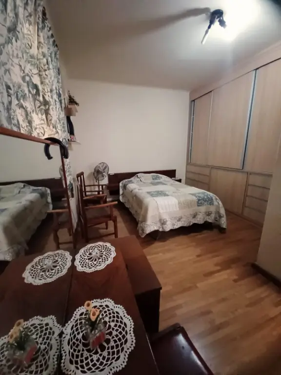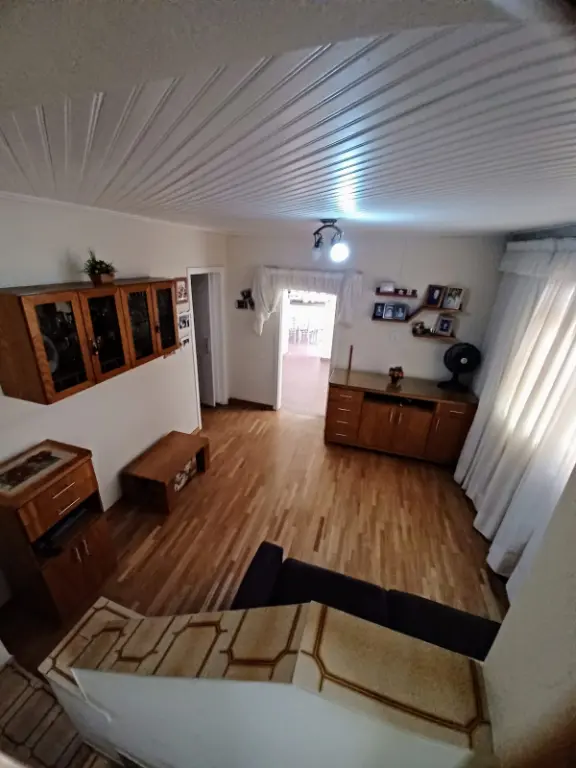 Casa com 3 dormitórios sendo 2 com armários, piso madeira, cozinha com armário e copa, 2 banheiros, piso frio, área de serviços, Edícula que também pode ser um escritório, corredor lateral.