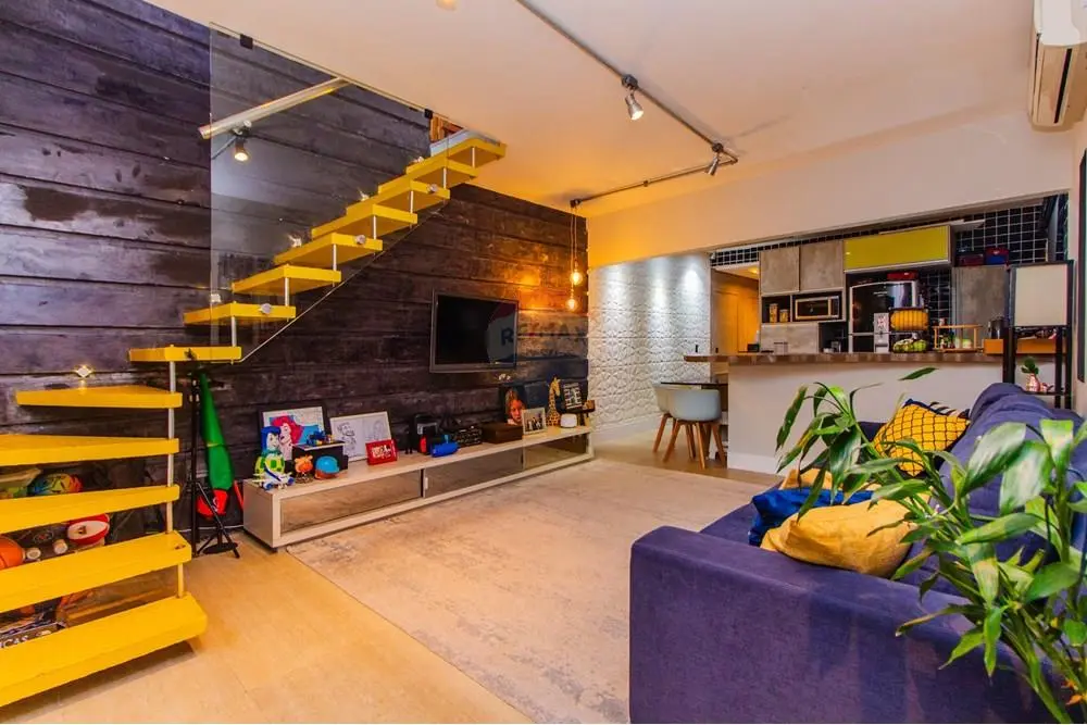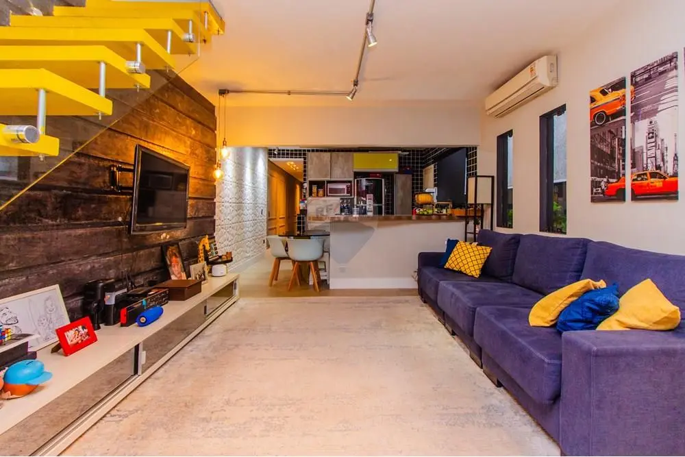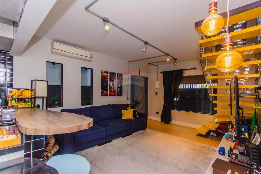 * Sala espaçosa e muito arejada através de uma grande janela de correr e mais 2 janelas pivotantes todas em vidro temperado, ar condicionado, parede com revestimento decorativo e piso em porcelanato travertino rústico romano com escada de acesso ao piso superior.