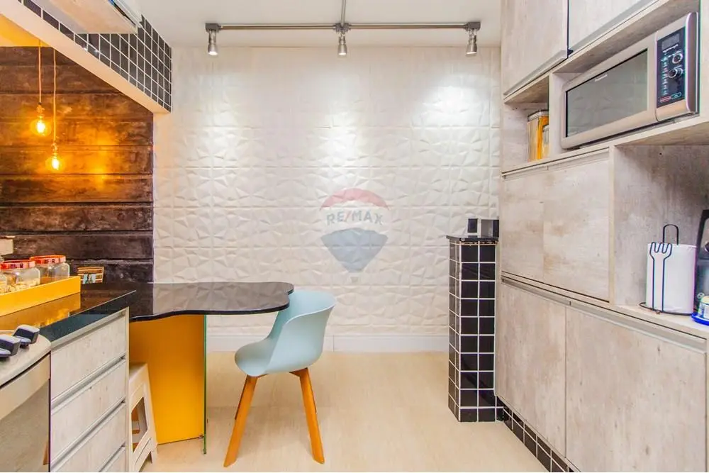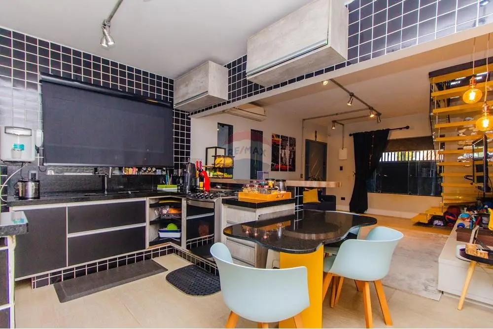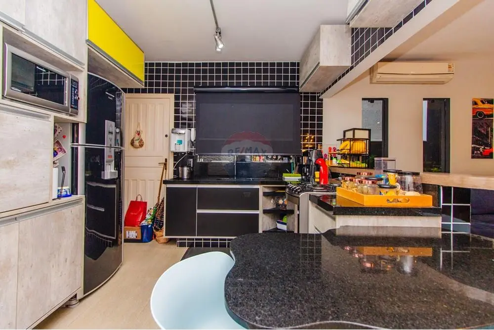 * Balcão em madeira e uma mesa em granito da copa dividem os ambientes revelando uma cozinha americana, com móveis sob medida, bancadas em granito, pia com cuba em inox e janela deslizante em vidro temperado com porta de acesso ao quintal, garantindo uma ótima ventilação.