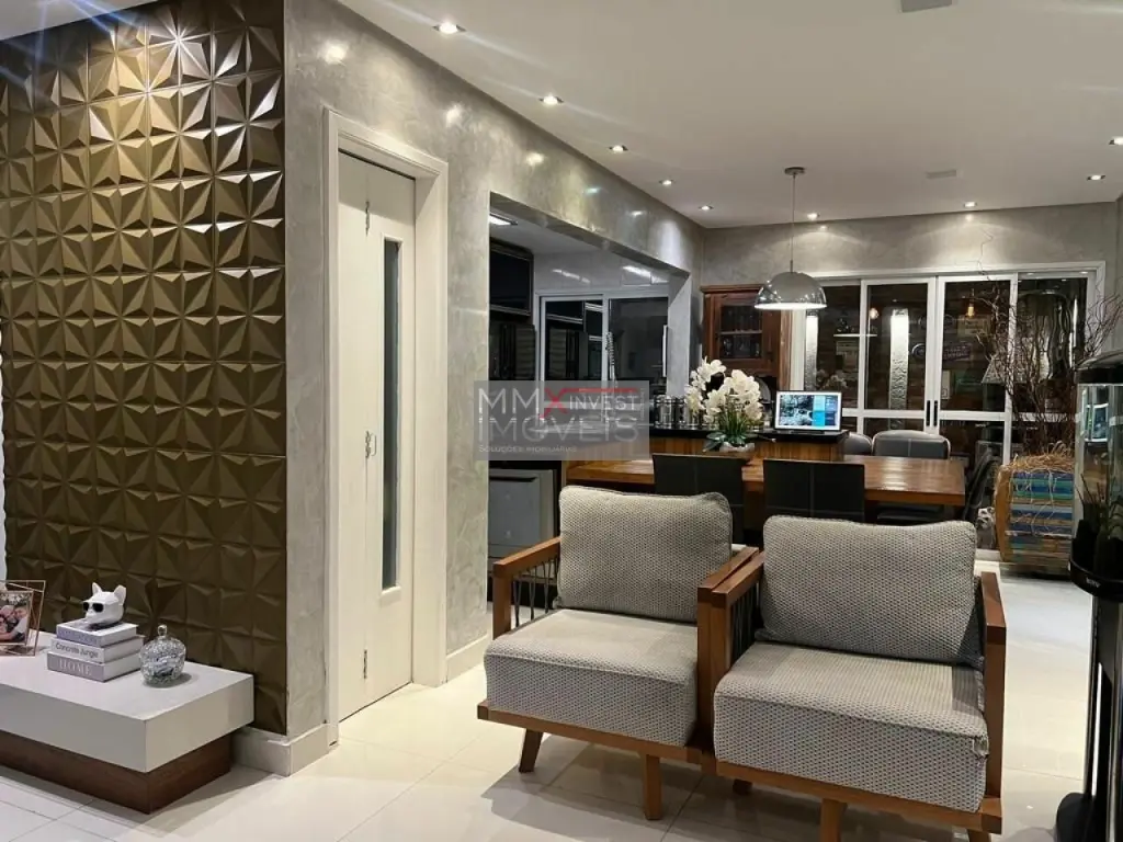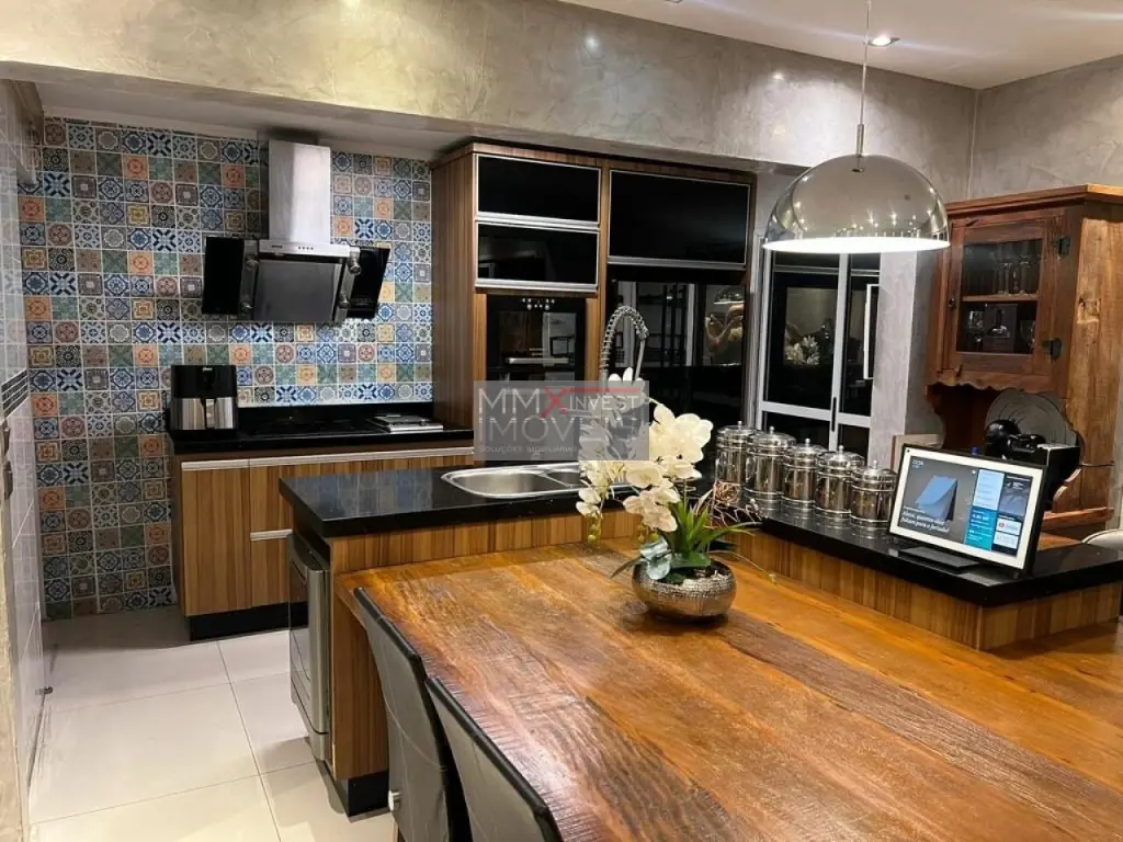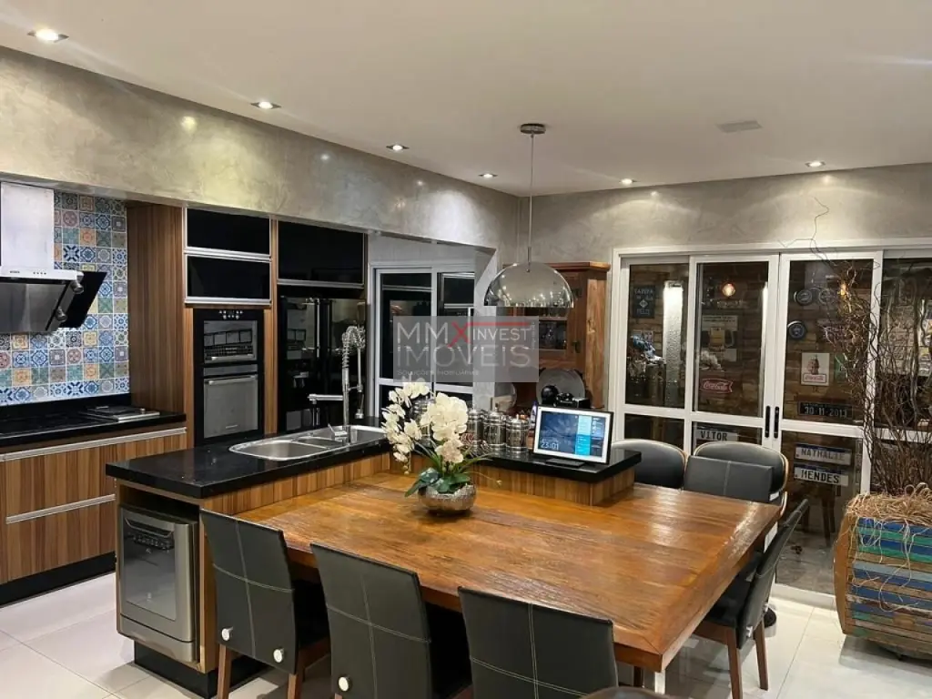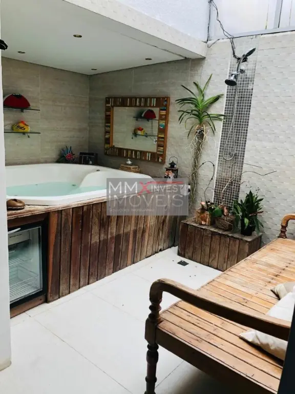 Spa, sauna e ducha, 3 dormitórios, sala integrada de estar e jantar, ilha gourmet integrando os ambientes, garagem para 3 automóveis, piscina e churrasqueira no condomínio e também na casa, condomínio com sistema de segurança e guarita blindada.