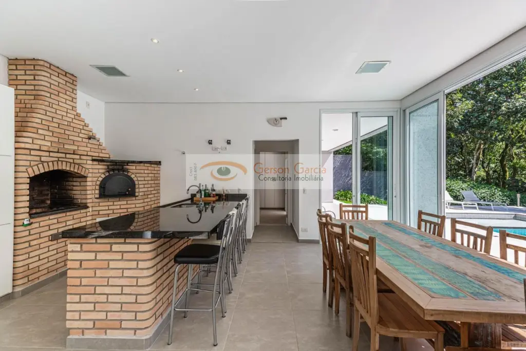 O espaço de lazer é completo e acolhedor, com segunda área gourmet equipada com churrasqueira, forno a lenha para pizza, espaço de TV e home theater, ilha com área de jantar, ducha ao ar livre, banheiro social, piscina aquecida com praia e hidromassagem, além de um belo jardim com vista permanente para a mata atlântica.