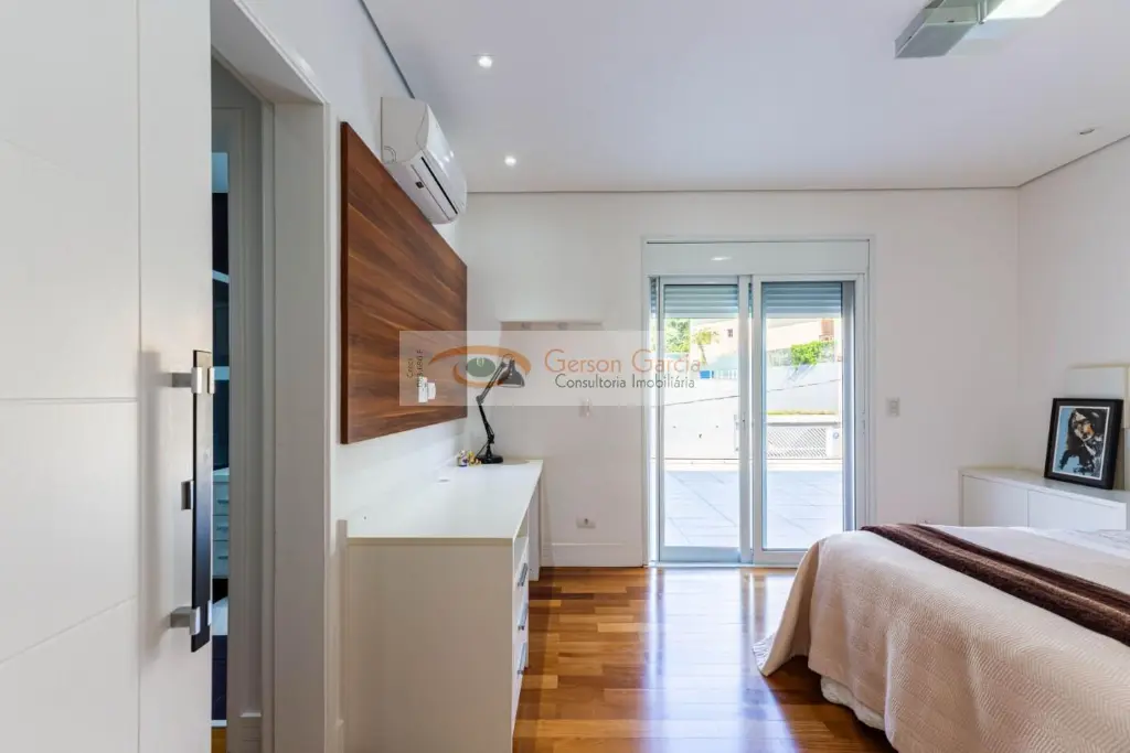 A área íntima dispõe de 5 dormitórios, sendo 4 suítes. Três delas são amplas, com ar-condicionado, walk-in closet e varanda. Há ainda um dormitório com banheiro junto à área da piscina e um quinto quarto com banheiro de serviço, atualmente utilizado como depósito.