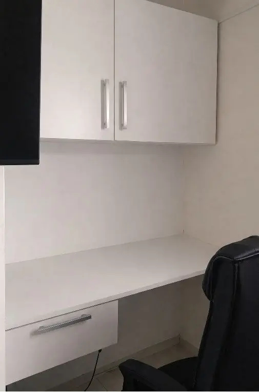 Quarto do casal com guarda-roupa planejado e espaço para escritório