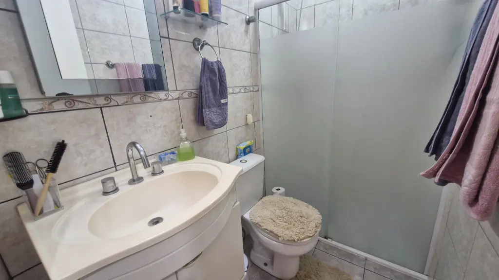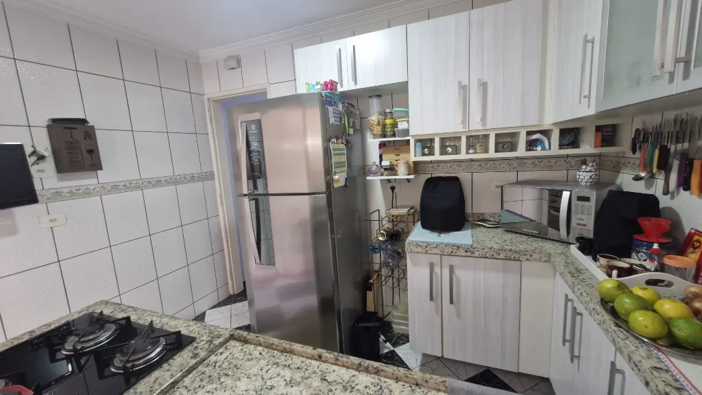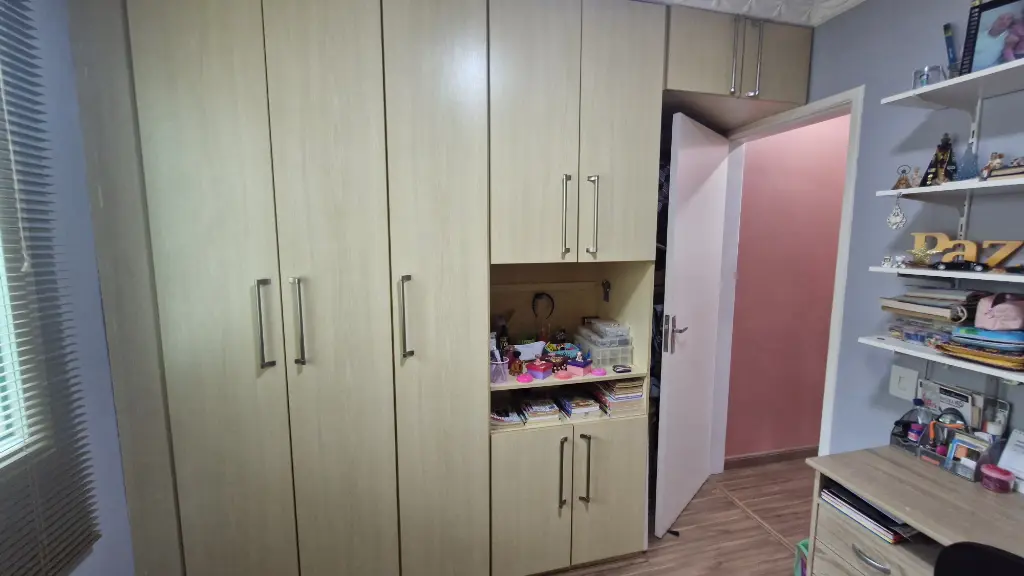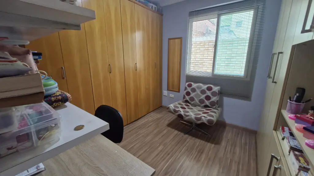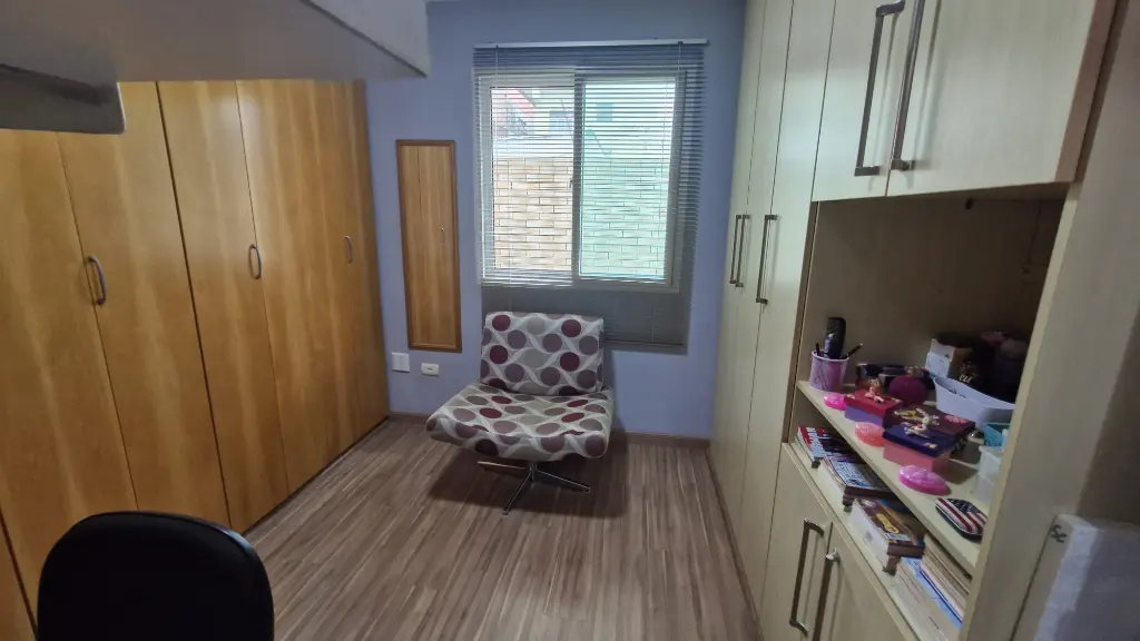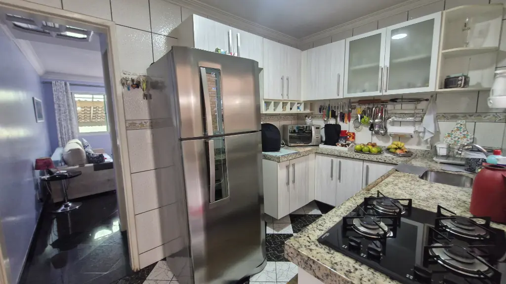 02 dormitorios, sendo que 1 com armário planejado, corredor com armário, sala em piso de granito, escada em piso de granito, lavabo, cozinha com armários planejados, lavanderia com cobertura retrátil, 01 vaga de garagem coberta.