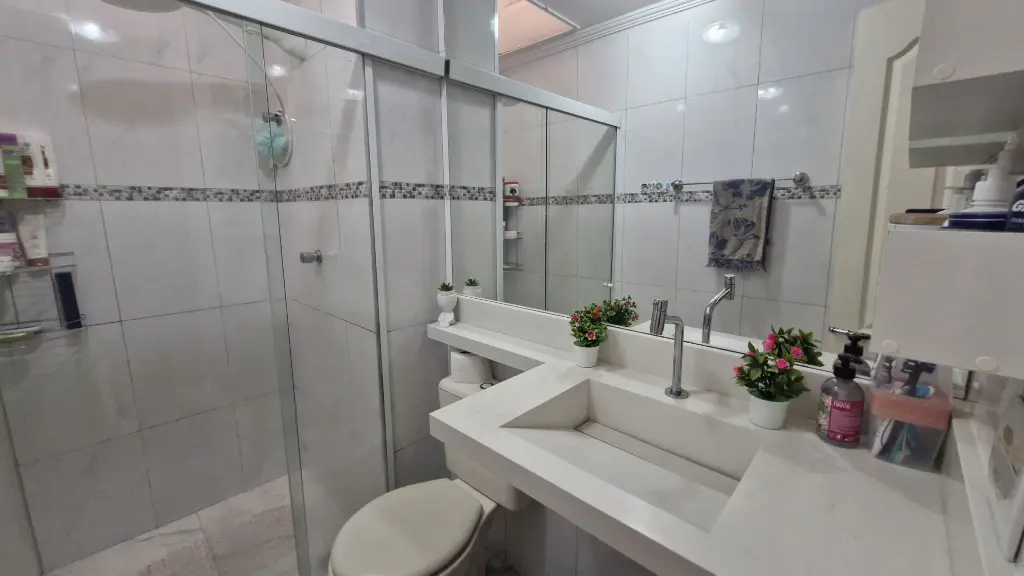 - 1 banheiro social com box de vidro e lavabo na sala