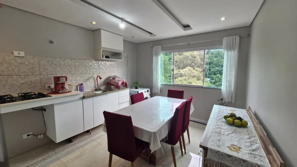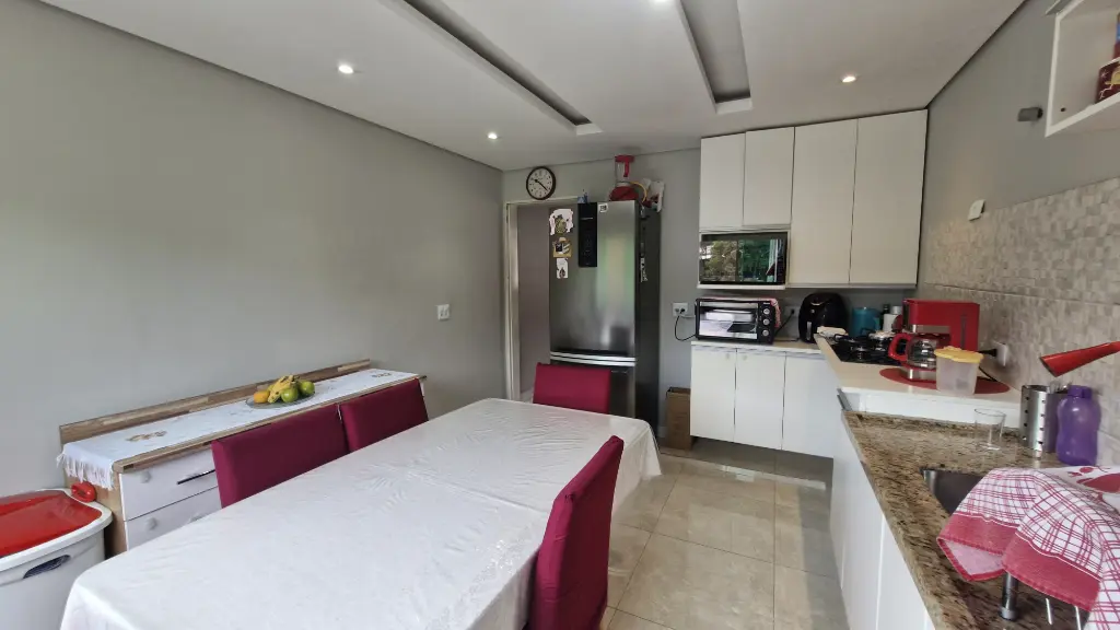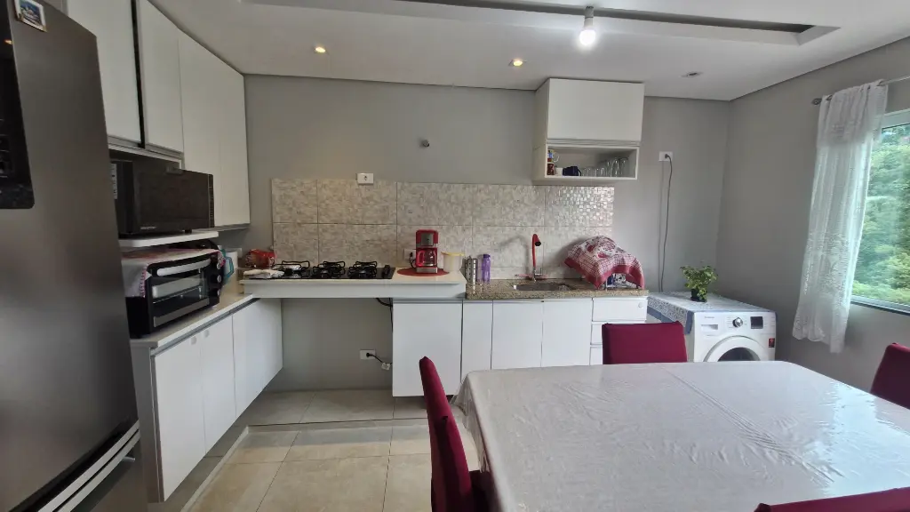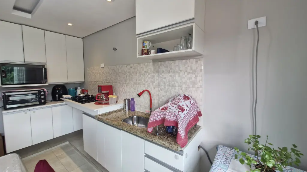 - Cozinha estendida com vista livre, envidraçada, piso em porcelanato, sancas e teto rebaixado em gesso
