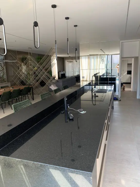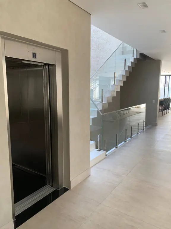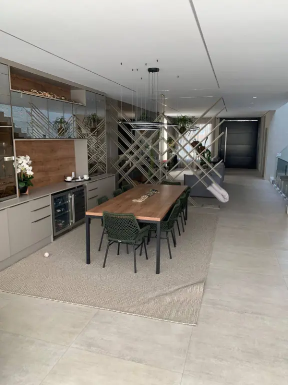 Pavimento Térreo: Ao entrar, você se depara com uma ampla sala de estar integrada à cozinha gourmet em conceito aberto, toda equipada com uma grande ilha central, perfeita para refeições e socializações. A churrasqueira moderna complementa o espaço, acompanhada por uma imensa mesa de almoço e jantar. Este pavimento também conta com uma despensa funcional, uma ampla lavanderia, um elegante lavabo, um espaço de co-working ideal para trabalho remoto, e um elevador privativo que atende os três pavimentos.