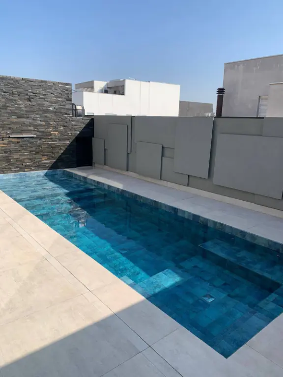 A área externa é igualmente impressionante, com uma piscina de 8,5m x 2,5m, perfeita para momentos de lazer. Conta também com um banheiro externo, casa das máquinas e bomba da piscina, além de corredores laterais que conectam diretamente à garagem no pavimento inferior.