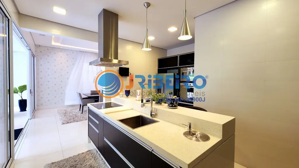 Cozinha ampla, integrada à copa e à sala de jantar