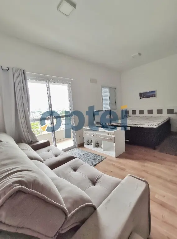 Loft de 42m² 100% mobiliado e decorado, com todos os eletrodomésticos e planejados; geladeira, microondas, utensilios, cooktop, mesa de jantar com cadeiras, rack com tv, sofa, cortina, tapetes, cama, armarios, mesa e cadeira de escritório, banheiro com box, chuveiro e gabinete de pia