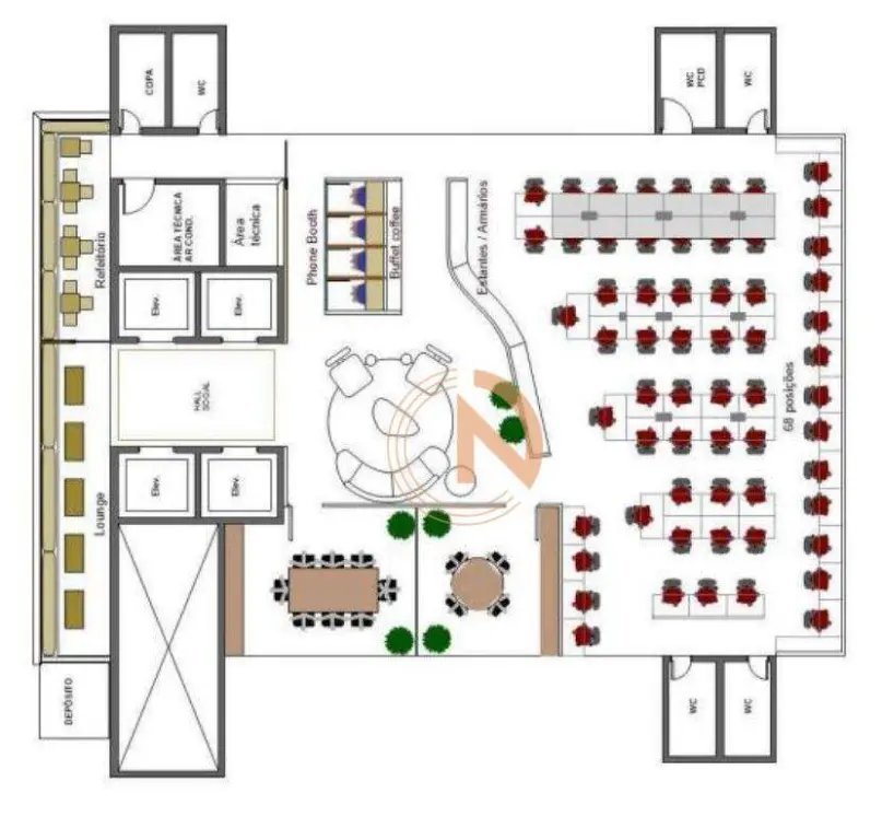 Laje sem obstruções com capacidade para mais de 70 pessoas. por pavimento