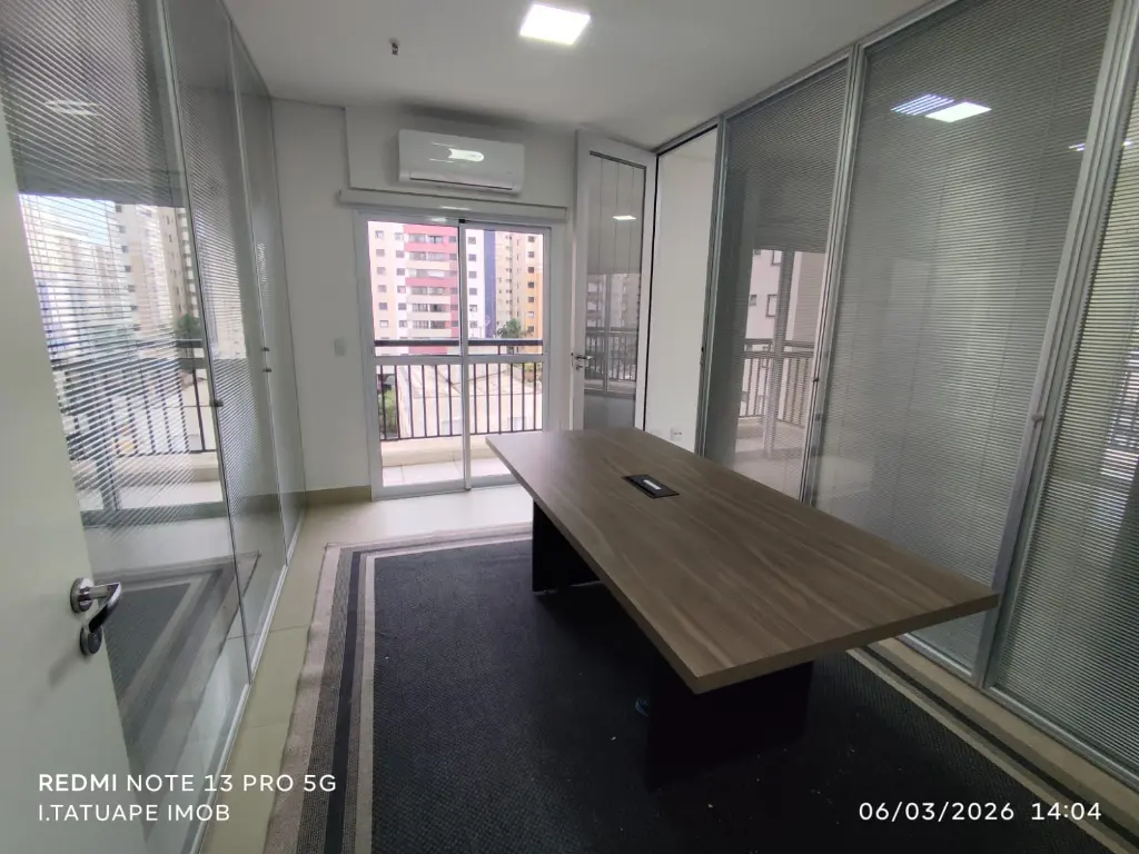 Sala de reunião envidraçada com mesa de reunião, ar-condicionado e sacada