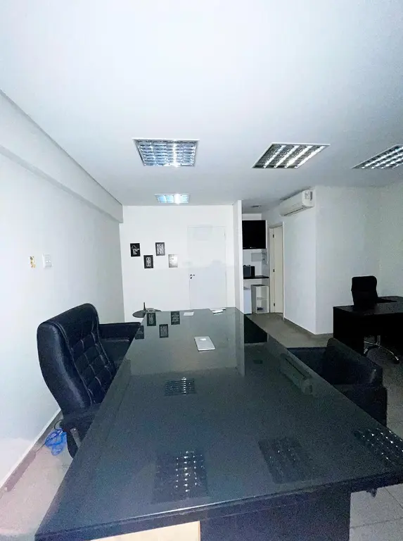 Sala Comercial para "Locação" com 32 m², totalmente mobiliada, dispõe de ar condicionado, 3 mesas, 2 cadeiras de espaldar alto, 1 cadeira modelo presidente, 2 poltronas, gabinete, decorações, mini cozinha equipada com frigobar, micro-ondas, filtro de água, armário, além de uma ante-sala e um banheiro.