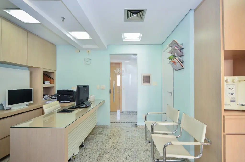 A sala em questão tem 40m2 e conta com duas salas privativas, além de uma recepção muito bem estruturada, com espaço suficiente para acomodar uma equipe de atendimento. Além disso, o espaço conta com dois banheiros e 2 vaga de estacionamento.