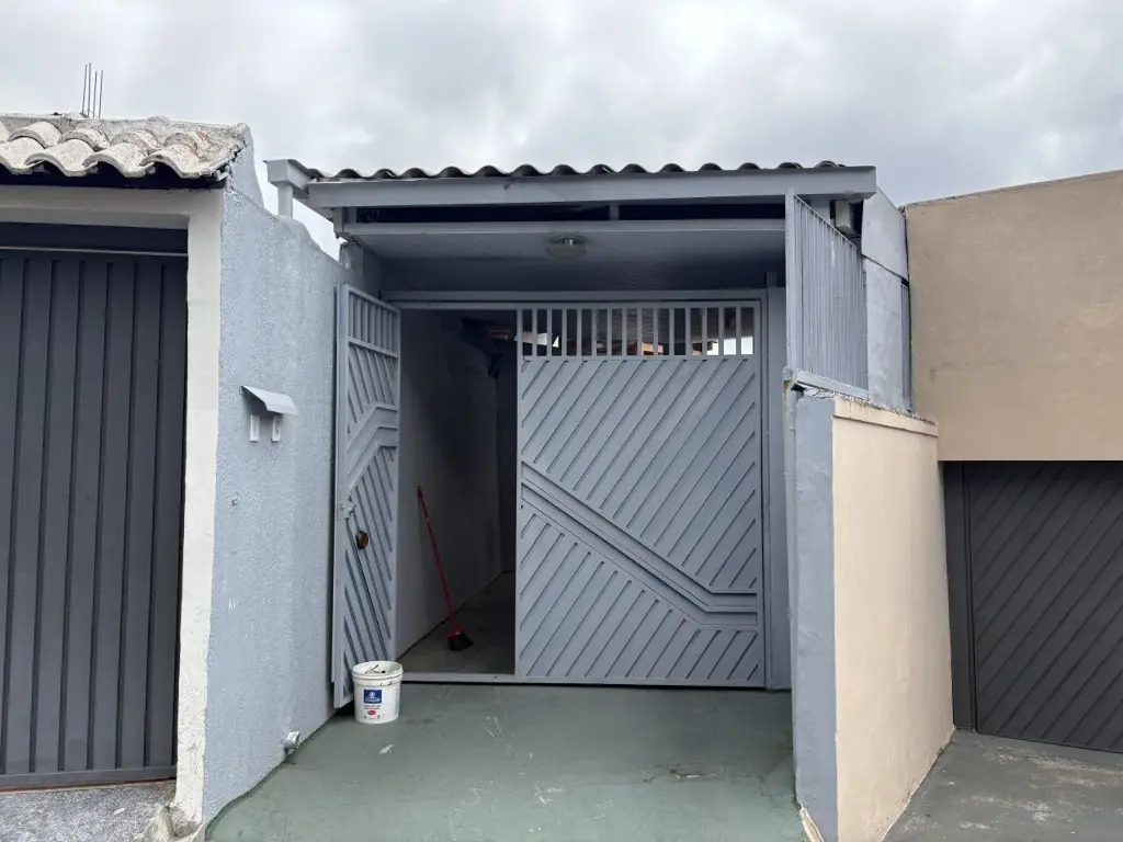 Rua com portão, tranquila e residencial.