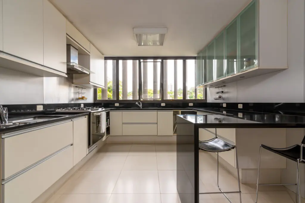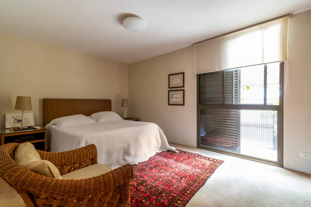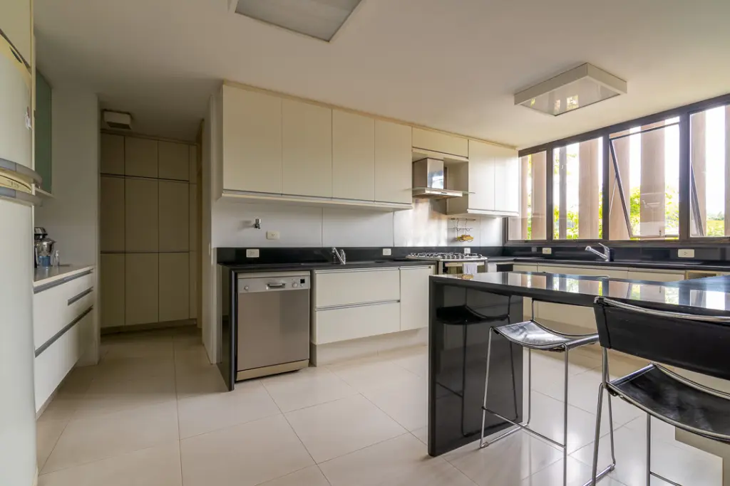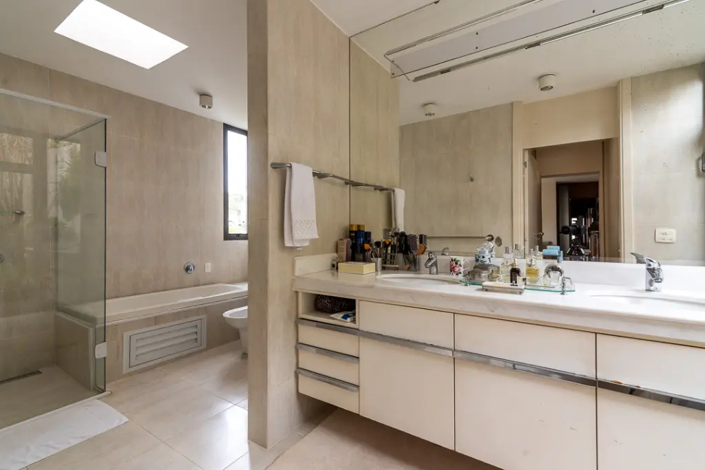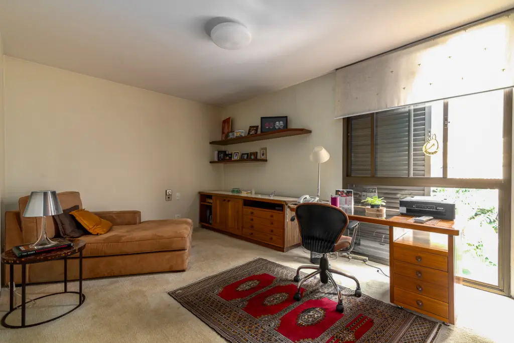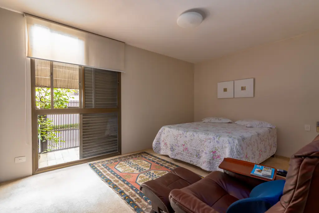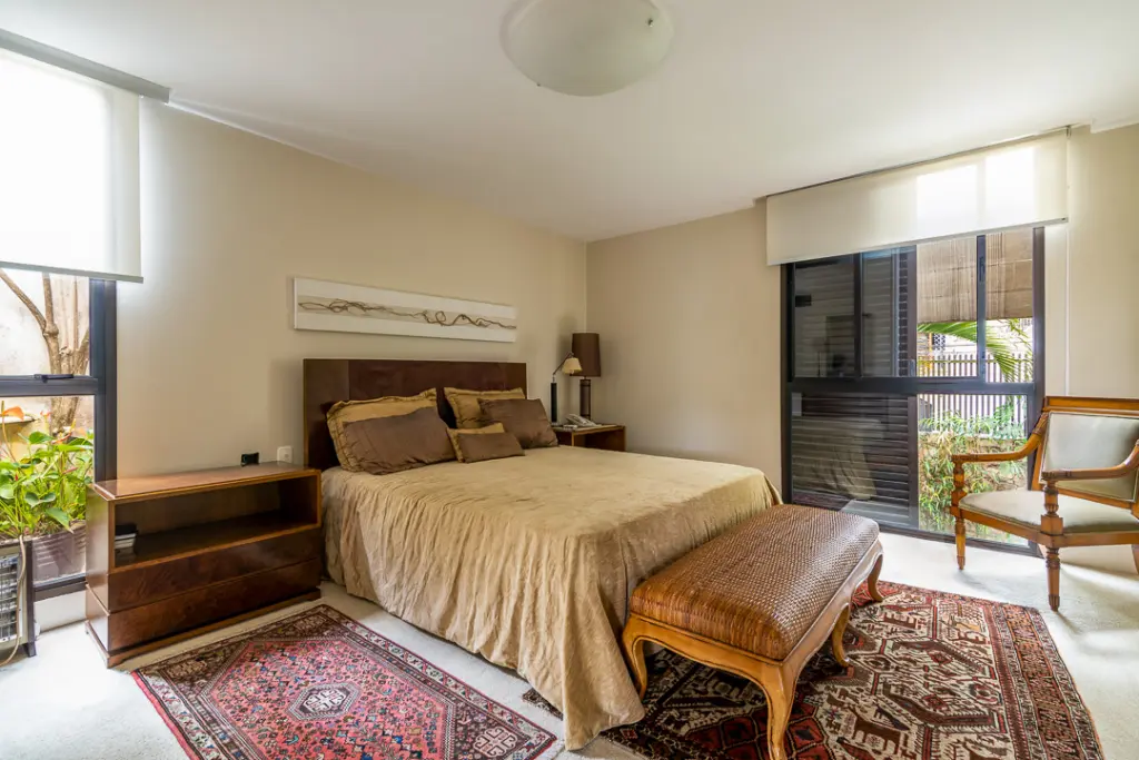 A área íntima possui sala íntima ampla com lareira e varanda, escritório e mais quatro suítes, sendo a máster a com closet e banheiro com banheira e jardim lateral. Conta com rouparia ampla e lavanderia.