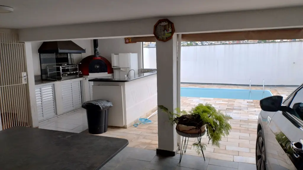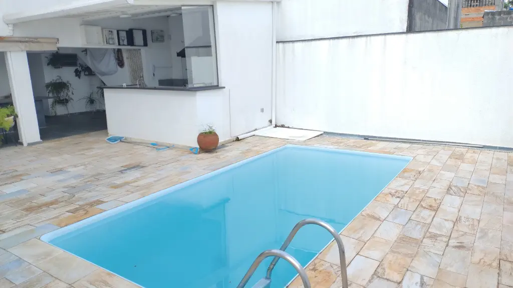 São 2 dormitórios amplos, 3 banheiros, cozinha, lavanderia, sala ampla, entrada lateral, salão de festas, quintal e piscina.