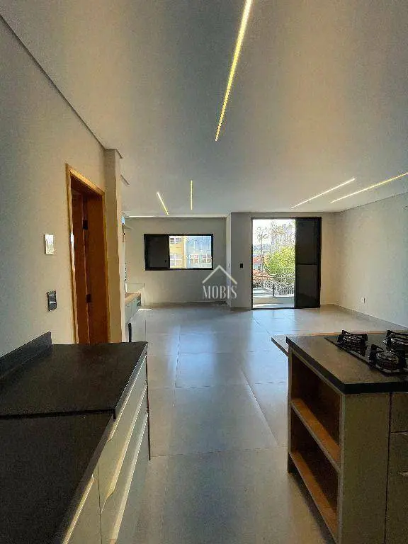 Sala dois ambientes integrada com cozinha planejada com ilha e cooktop
