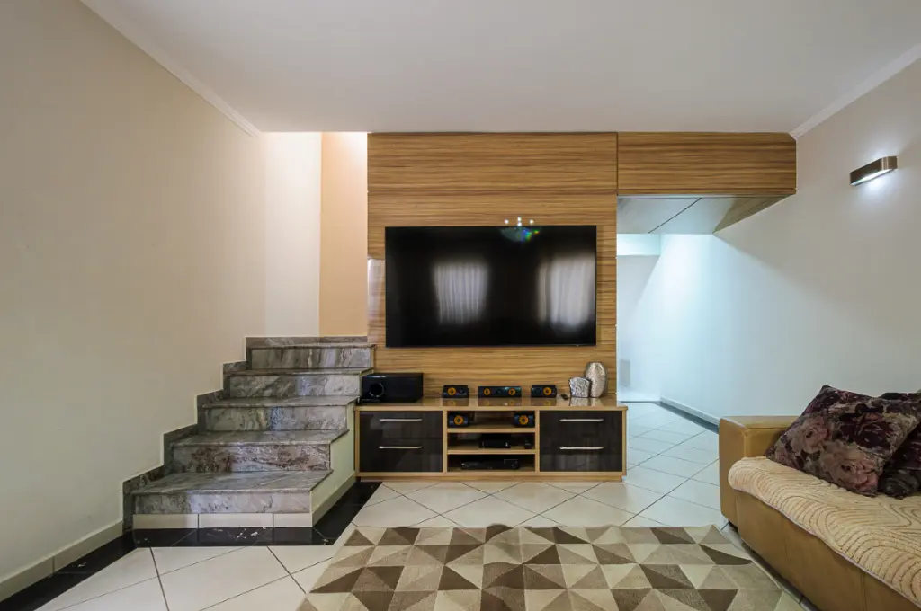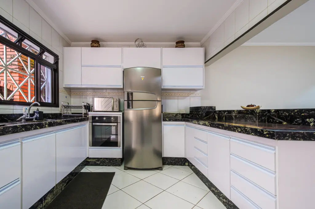 No nível da rua, o sobrado oferece acesso à garagem com portão automático e capacidade para até quatro automóveis, garantindo segurança e comodidade. Através de escada se tem acesso ao piso intermediário.