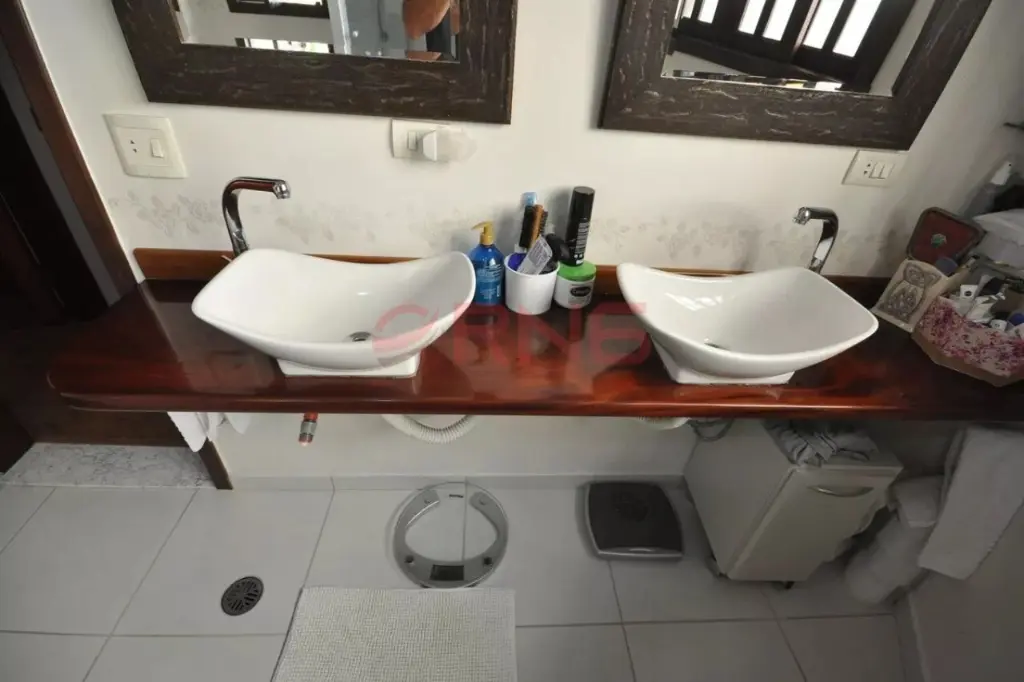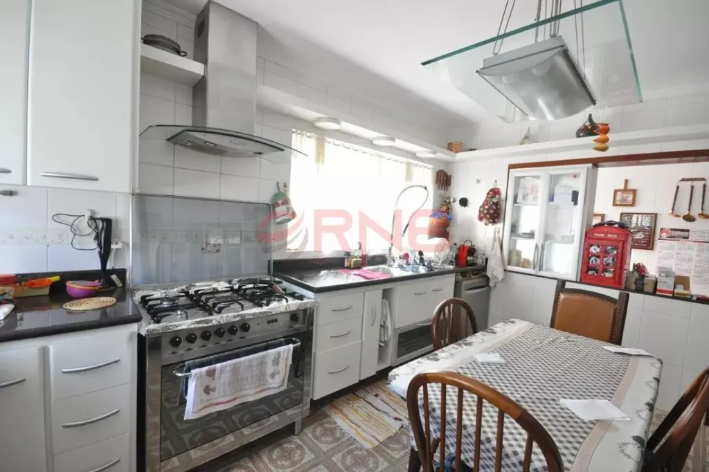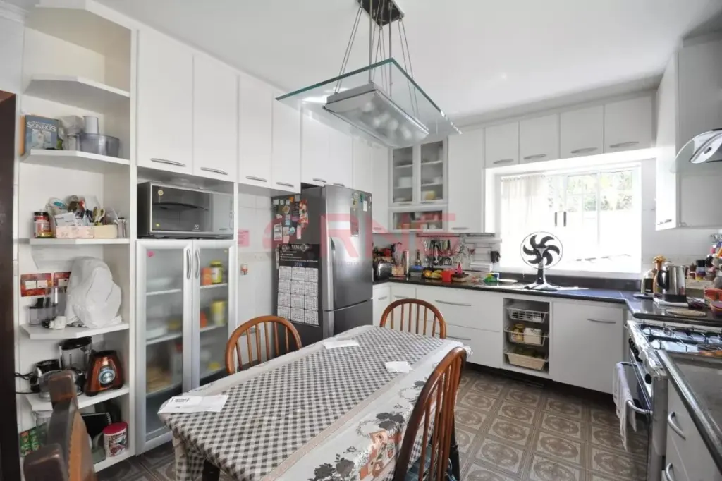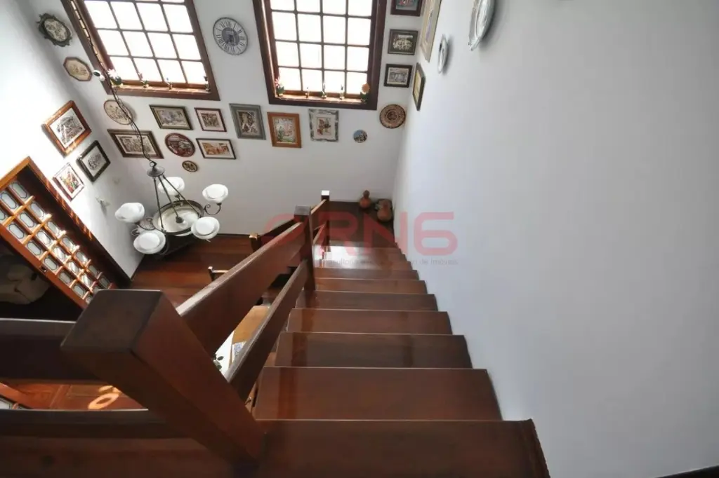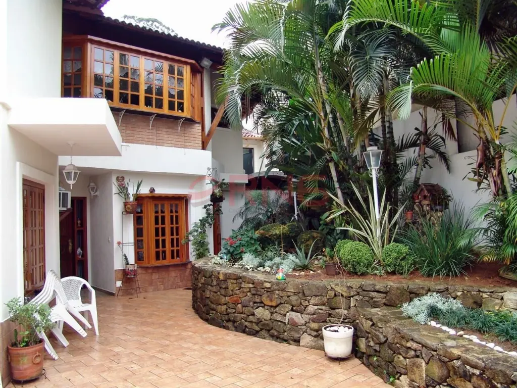 Sobrado bem arejado, sendo a frente com muro todo coberto com verde e calçada de 3 metros e com um limoeiro, possui entrada social, piscina com chuveiro externo, área gourmet ampla com churrasqueira coberta, bancada em granito de 3 metros com 2 cubas, banheiro, quintal grande com jaboticabeira, goiabeira e alecrim, sala de estar com 2 paredes com tijolinho à vista, adega e 2 janelas de madeira bay window, lavabo com pia de granito, sala de jantar com pé-direito duplo, sala de TV ampla com 2 janelas com vista para a piscina, lareira, cozinha com planejados até o teto e em toda a volta, espaço para fogão de 5 bocas, espaço para lava louças e para freezer, bancada longa em granito, área de serviço coberta, com quarto e banheiro de serviço, área seca e molhada, com armários planejados de chão a teto, com acesso pela sala de estar, cozinha e também pelo corredor lateral que dá para a garagem, piso ardósia, piso frio na parte inferior da casa, escada em madeira, piso de madeira nobre, portas de correr de madeira na sala de estar e TV, 2 dormitórios grandes na frente com vista para rua, ambos suítes com janelas e porta balcão de alumínio branca, varanda e sendo 1 com banheira, 1 suíte master com avanço tipo varanda, janela bay window de 3 metros, banheiro com banheira para 2, box de vidro, bancada com 2 pias, 2 janelas de madeira, closet com planejados, 1 dormitório com planejados que pode ser usado como continuação do closet da suíte master, com janela de vidro, e atrás possui mais 1 suíte com closet que pode ser fechada se tornando uma suíte separada, aquecimento central com boiler, escada de piso frio que dá para a sala de estar, com o total de 7 banheiros e garagem coberta para 5 carros.
