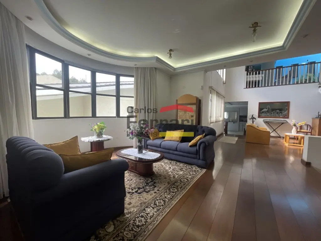 Piso térreo com sala de estar, sala de lareira, sala de TV, sala bar com pé direito duplo, tudo piso assoalho, escritório, sala de jantar, cozinha ampla planejada, copa, dependência de empregada completa, mais um quarto, área de serviço, quintal.