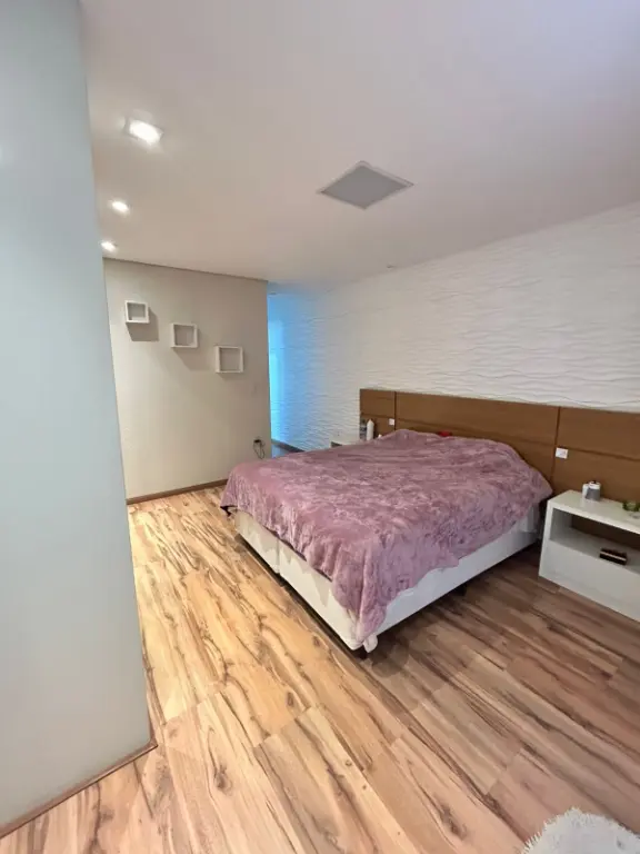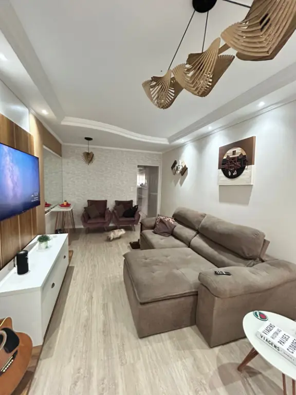 Possui 2 dormitórios sendo 1 suíte com banheira e armário planejado, sala, cozinha com móveis planejados, área de serviço, 1 dormitório de serviço com banheiro, área de churrasqueira e 2 vagas de garagem.
